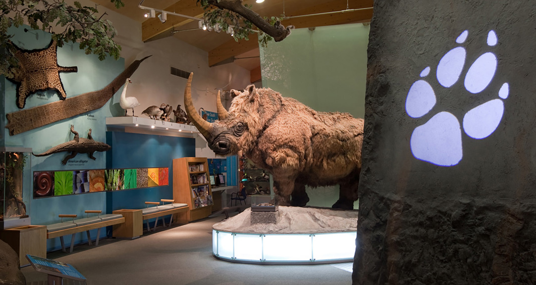 An adult and a child smiling at each other and holding hands in front of museum displays